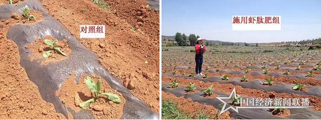 對于年年歉收,甚至絕收的煙草種植土地,施用蝦肽甲殼素系列肥料后,可以讓土壤pH從5.4上升到6.0,土壤疏松透氣、大量繁殖蚯蚓,株株盤繞蚯蚓,多的有十多條,少的有四五條,同時土壤中有益菌群大量培植,使整個土壤微生態(tài)正常運轉(zhuǎn),土質(zhì)變好比較肥沃適合作物生長。