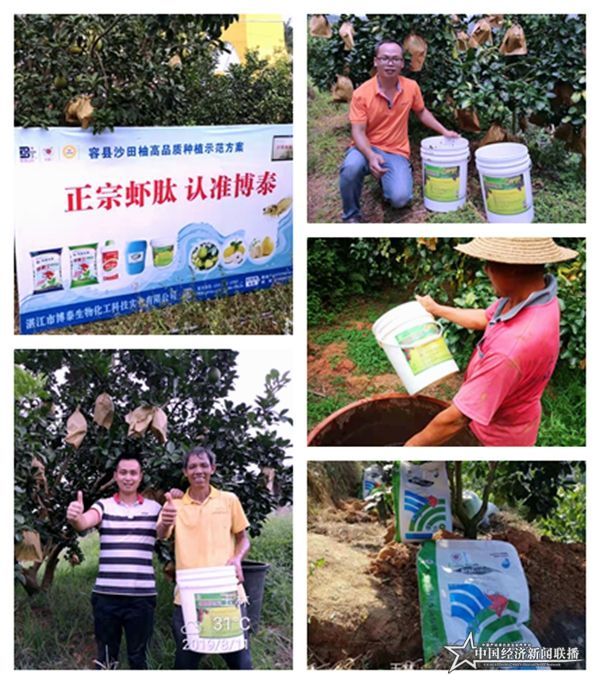 陀桂成通過幾年柚園使用博泰蝦肽肥心得,說起蝦肽肥的功效也是頭頭是道。他說,博泰公司生產(chǎn)的蝦肽有機肥,含有多種微量元素、寡糖和大量活性菌,基本上作物需要的營養(yǎng)元素都包含啦,單品看似貴一點,但用的少,實際算起來還是省錢。而且用了博泰的有機肥后,能直接作用于柚樹的根系,讓樹的根系發(fā)達,自然樹勢也就長的好,葉子綠,掛果多,果子品質(zhì)也好。