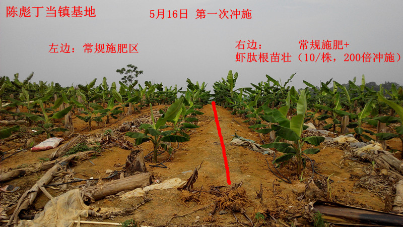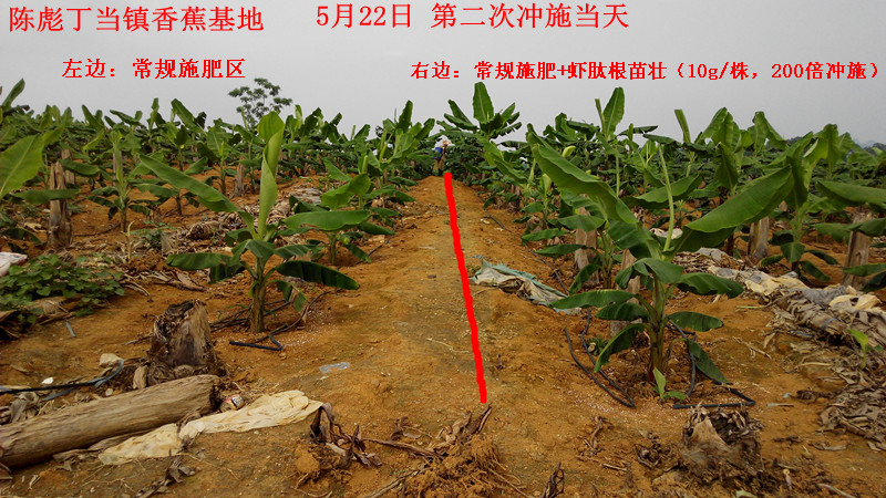試驗(yàn)方法:對(duì)同一地點(diǎn)分別同時(shí)對(duì)香蕉施加常規(guī)肥料和蝦肽根苗壯,觀察香蕉的生長情況和根部的觀察。