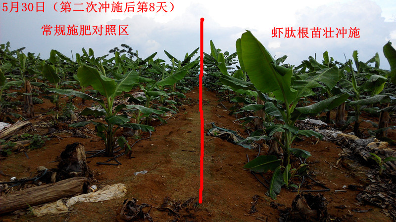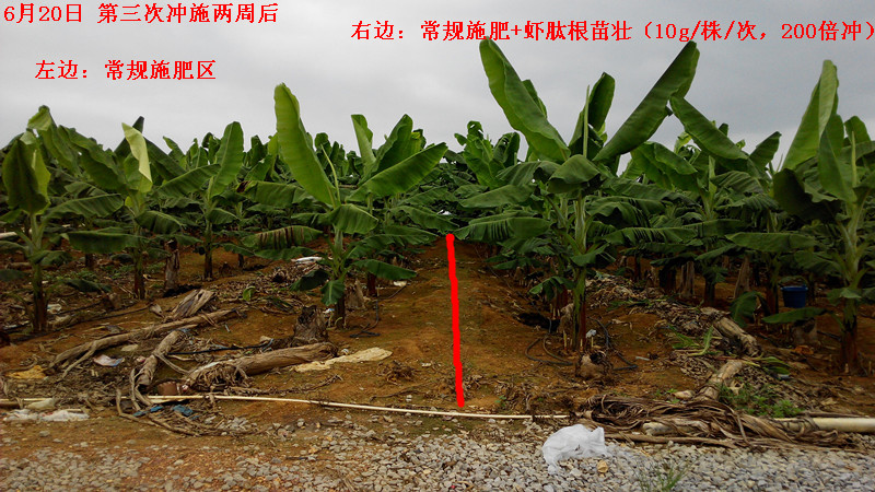 在圖中可以明顯地看出右邊施加蝦肽根苗壯的香蕉葉數(shù)比較多,葉色相對(duì)青翠。左邊的明顯葉數(shù)少,葉子帶少許黃化。