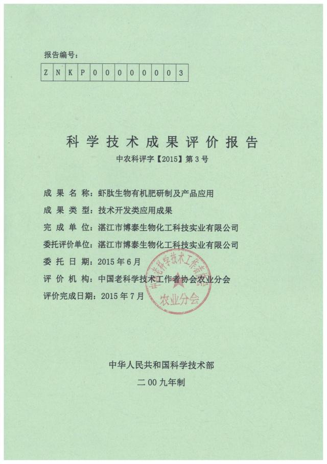 圖為 蝦肽生物有機肥的科學技術(shù)成果評價報告