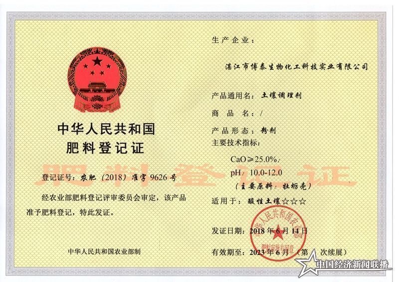 (湛江市博泰生物化工科技實業(yè)有限公司生產(chǎn)的土壤調(diào)理劑登記證)