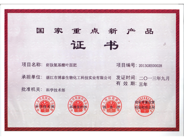 湛江博泰生物化工科技實業(yè)有限公司所研發(fā)生產的蝦肽肥在2013年9月被國家4部委聯(lián)合授予國家重點新產品證書。
